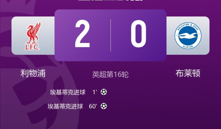 12月14日25/26赛季英超联赛第16轮,利物浦主场迎战布莱顿。埃基蒂克开场闪击破门,随后又接到萨拉赫的角球助攻完成梅开二度。乔-戈麦斯开场助攻后受伤离场。全场比赛结束,利物浦2-0战胜布莱顿。全场结束,利物浦2-0布莱顿。本场过后,利物浦8胜2平6负积26分排名第六;布莱顿6胜5平5负积23分位列第九。